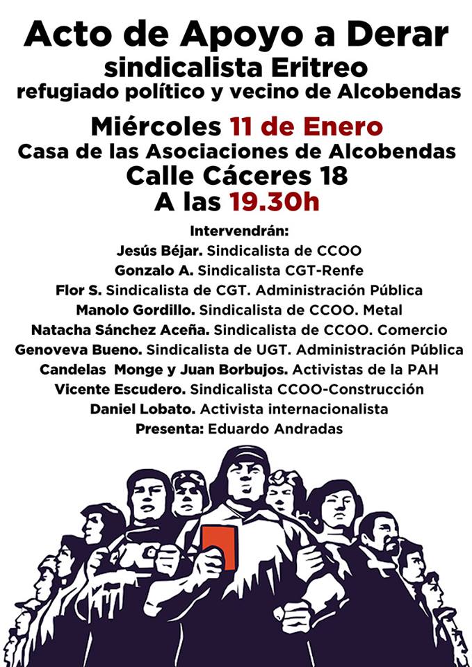 Mañana miércoles 11 de enero en la Casa de las Asociaciones de Alcobendas, trabajadores y sindicalistas realizan un acto de apoyo a Derar Hamed sindicalista eritreo, refugiado político desde niño, y hoy vecino de Alcobendas.