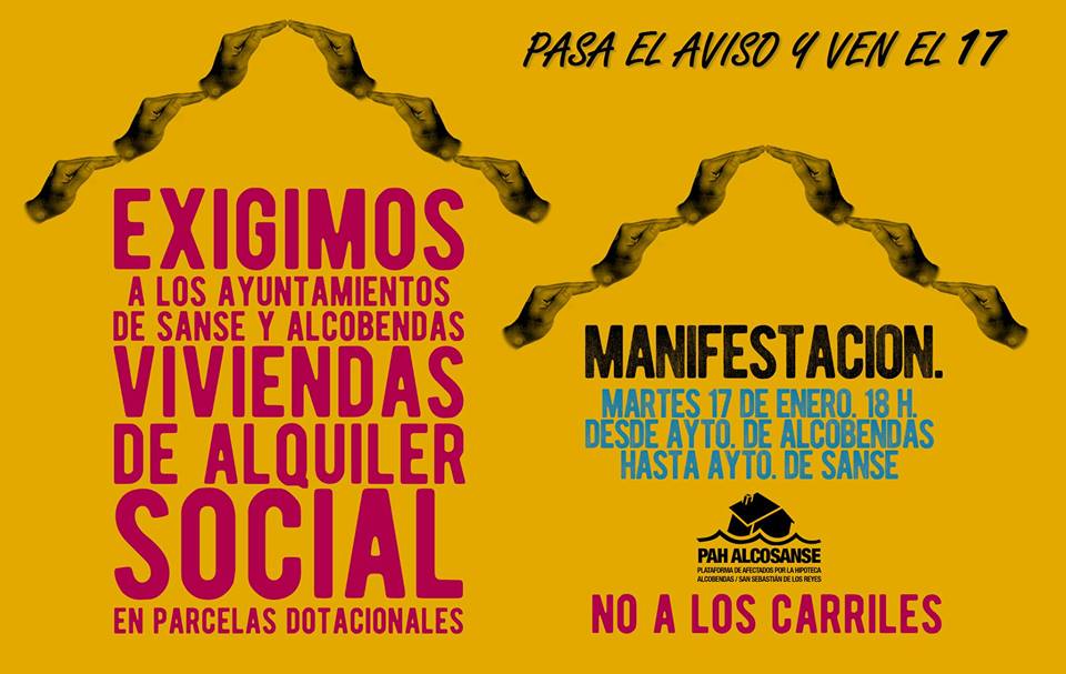 Mañana, 17 de enero, la Plataforma de Afectados por la Hipoteca (PAH) convoca una manifestación por la vivienda de alquiler social en San Sebastián de los Reyes y Alcobendas. La PAH considera que el derecho a una vivienda digna no puede estar guardado en un cajón y que «¡claro que es posible alquiler asequible en Alcobendas y Sanse!». Además, recuerda y reclama a ambos Ayuntamientos el «deber constitucional» de los poderes públicos para «hacer efectivos» los derechos de la ciudadanía y la obligación que tienen de «ofrecer soluciones que hasta ahora está cubriendo la sociedad civil».