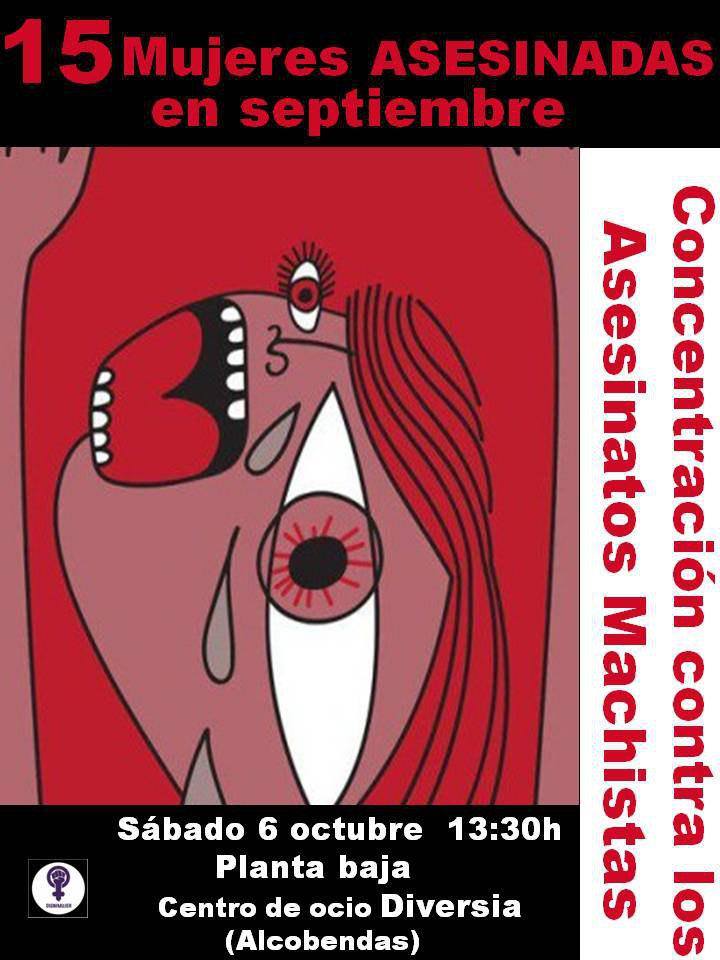 «Este mes de septiembre se ha cometido un asesinato machista cada 24 horas. Igual os cuesta creerlo, pero es que no son sólo cifras. Nosotras gritamos sus nombres y sus historias, las de todas las mujeres y criaturas que nos faltan. Pronunciamos sus nombres y os contamos cómo fueron sus vidas, cómo lucharon y a cuántas personitas inocentes dejaron huérfanas sus asesinos, esos «buenos padres» que iban a buscarlas al cole; los mismos que después las ahogaban en bañeras o degollaban. #Alcobendas#Sanse, como cada mes, os convocamos a nuestra#ConcentracionContraAsesinatosMachistas, porque – digan lo que digan los hijos del patriarcado – esto es #TerrorismoMachista y las instituciones y los gobiernos, los medios de comunicación y quienes negáis la evidencia, todos #SoisCómplices. Más de 100 asesinatos machistas al año, más de 1000 cadáveres desde que se lleva recuento. Más de 30 criaturas, muchas menores de 7 años, asesinadas por sus padres o padrastros. ¿Suficientemente grave como para dedicarle media hora de tu tiempo?»