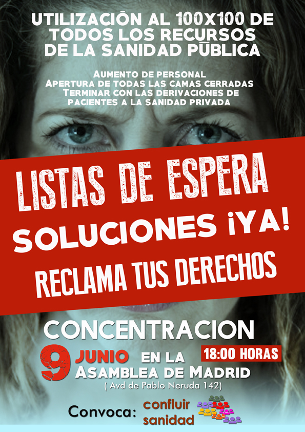 El viernes 9 de Junio la Plataforma «Confluir Sanidad» convoca una CONCENTRACIÓN frente a la Asamblea de Madrid en demanda de soluciones para la tremendas y crecientes listas de espera y la falta de trabajadores en el servicio sanitario madrileño.