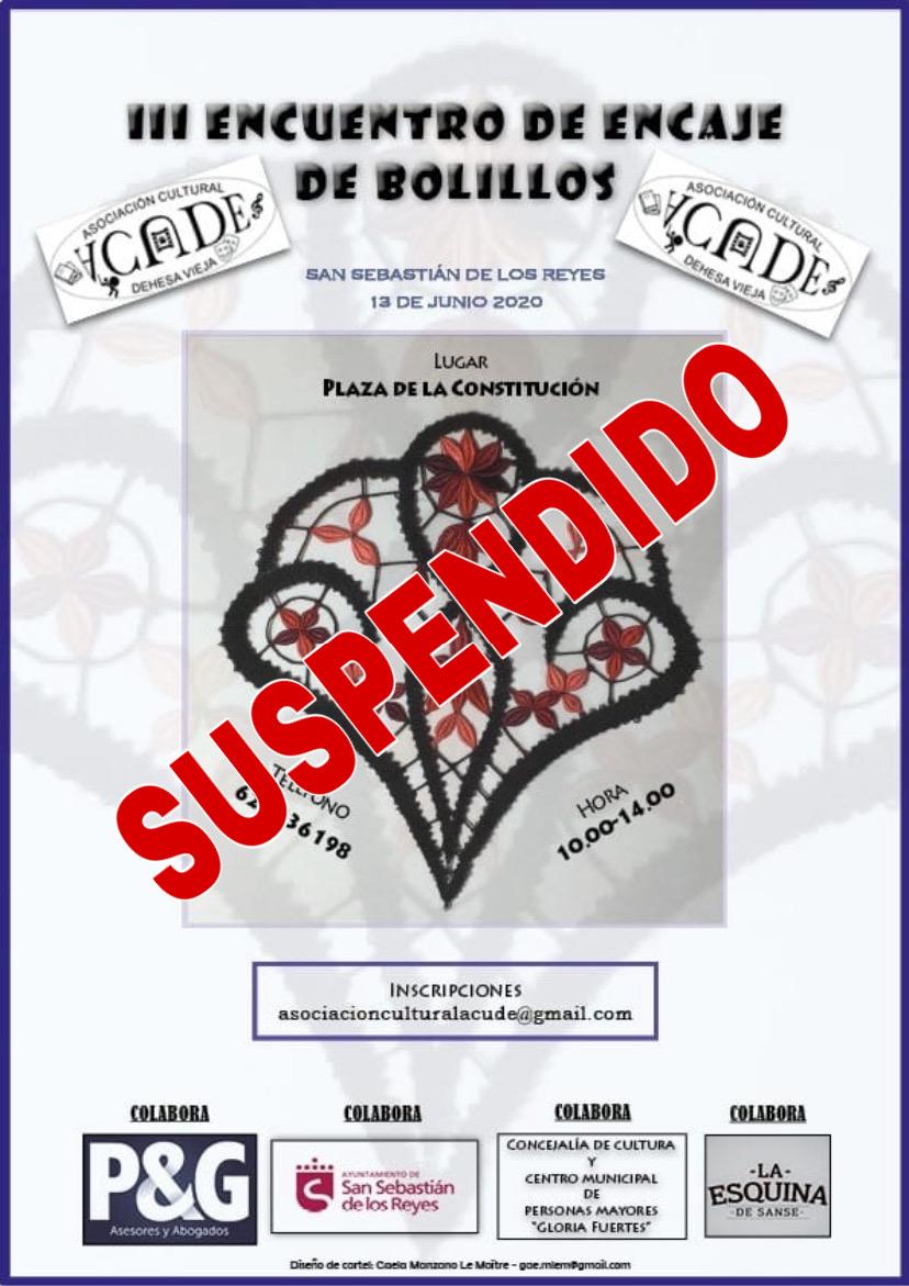 La Asociación Cultural Dehesa Vieja (ACUDE), organizadora del III Encuentro de Bolillos en San Sebastián de los Reyes, ha decidido suspender el evento que iba a tener lugar el próximo mes de junio. La responsabilidad y colaboración con estas fases de desescalada, aun en plena pandemia del Covid-19, son las principales razones del colectivo para tomar esta decisión.