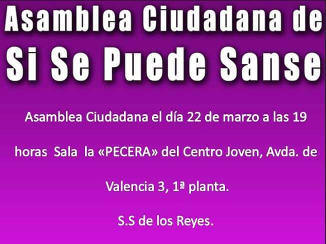 La Asamblea tendrá lugar el jueves 22 de marzo a las 19,00h en la sala La Pecera del Centro Joven de Sanse-Avenida de Valencia, 3 1ªplanta-. El encuentro es abierto.