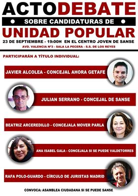 La Asamblea de Si Se Puede Sanse celebra el viernes 23 de septiembre un Debate Público sobre las llamadas «Candidaturas de Unidad Popular», que surgieron en las pasadas elecciones municipales de mayo 2015.