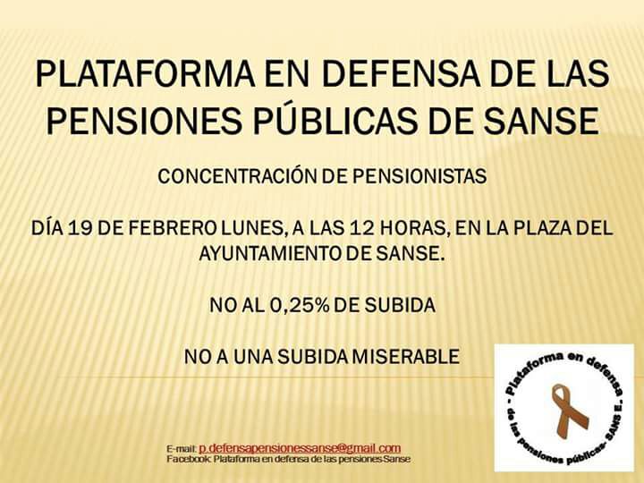 Dentro de pocas horas, el lunes 19 de febrero a las 12,00 de la mañana, en la Plaza de la Constitución del Sanse -Plaza del Ayuntamiento- se convoca a todos los pensionistas, pero también a los que no lo son, y no saben si lo serán, pero que les parece igualmente indignante la subida de un 0,25% de las pensiones, la siembra de duda sobre la pervivencia de jubilaciones públicas, la generación de un empleo precario que no permite vivir ni plantearse un futuro digno y seguro….