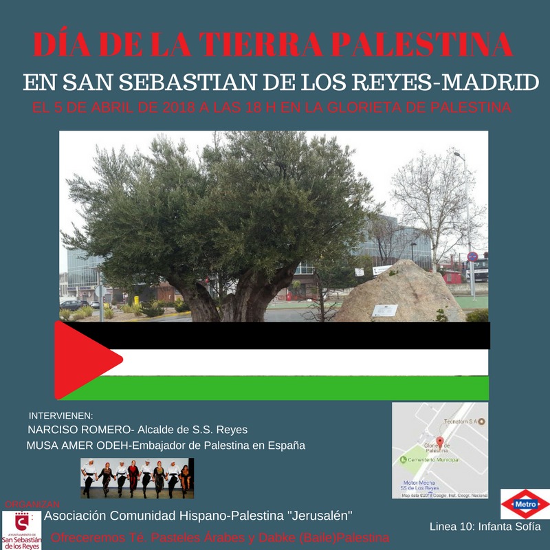 Hoy jueves 5 de abril a las 18,00h en la Glorieta de Palestina de San Sebastián de los Reyes, inaugurada en 2016, la Asociación Comunidad Hispano-Palestina «Jerusalem» conmemora El Día de la Tierra Palestina con las intervenciones de Narciso Romero, Alcalde de San Sebastián de los Reyes, y Musa Amer Odeh, embajador de Palestina en España.