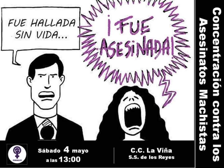 Mañana sábado 4 de mayo, a las 13h, frente al centro comercial La Viña de San Sebastián de los Reyes, nueva concentración contra los asesinatos machistas.