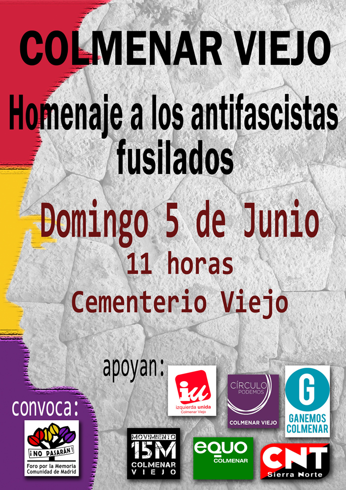 El Foro de la Memoria de la Comunidad de Madrid convoca este homenaje y cuenta con el apoyo de organizaciones como la Asamblea 15-M Colmenar Viejo, Equo, Ganemos, Izquierda Unida, Podemos y CNT Sierra Norte. Vecinos, vecinas y otras organizaciones de izquierdas de S.S. de los Reyes y otras localidades del norte de Madrid secundan la convocatoria.