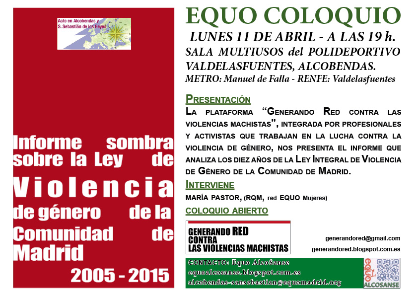 El Grupo Local Equo Alcosanse, retoma los Equo Coloquios, como manera de compartir, debatir, concienciarnos y concienciar… desde la Ecología política, temas importantes y campañas, en marcha, además de colaborar con colectivos, como en éste caso la Plataforma: Generando Red Contra las Violencias Machistas, que nos presenta, el «informe Sombra», sobre la ley de Violencia de Género.