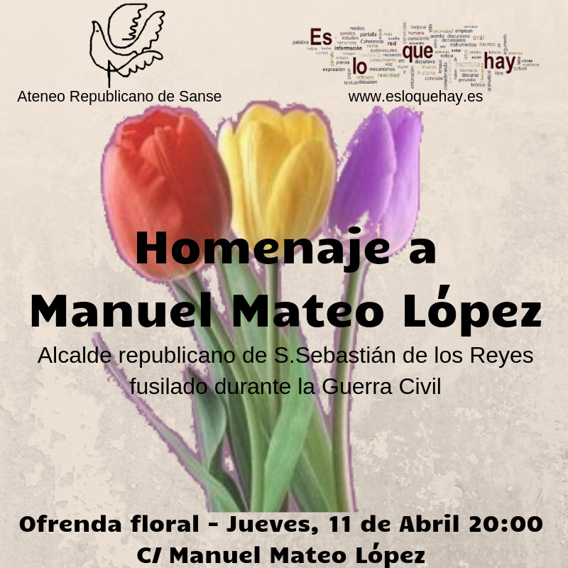 El Ateneo Republicano de Sanse invita a acompañarles. Compañía para poner unas flores en la Calle que lleva el nombre de Manuel Mateo López, Alcalde republicano de San Sebastián de los Reyes que fue fusilado el 22 de octubre de 1939, en domingo, y un día antes de que llegara su indulto. Esloquehay estaremos ahí.