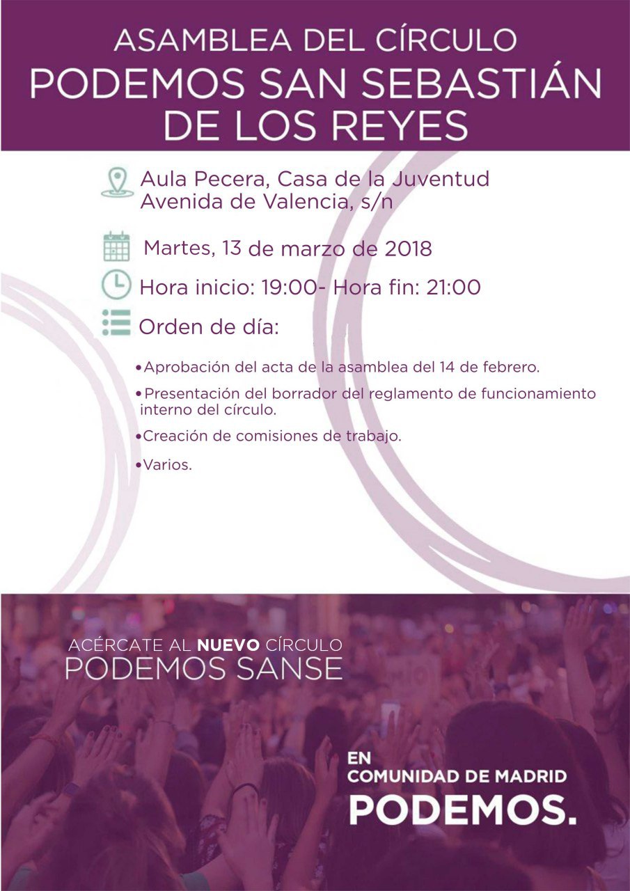 Hoy martes 13 de marzo el recién constituido Círculo Podemos SanSe celebra de nuevo Asamblea.