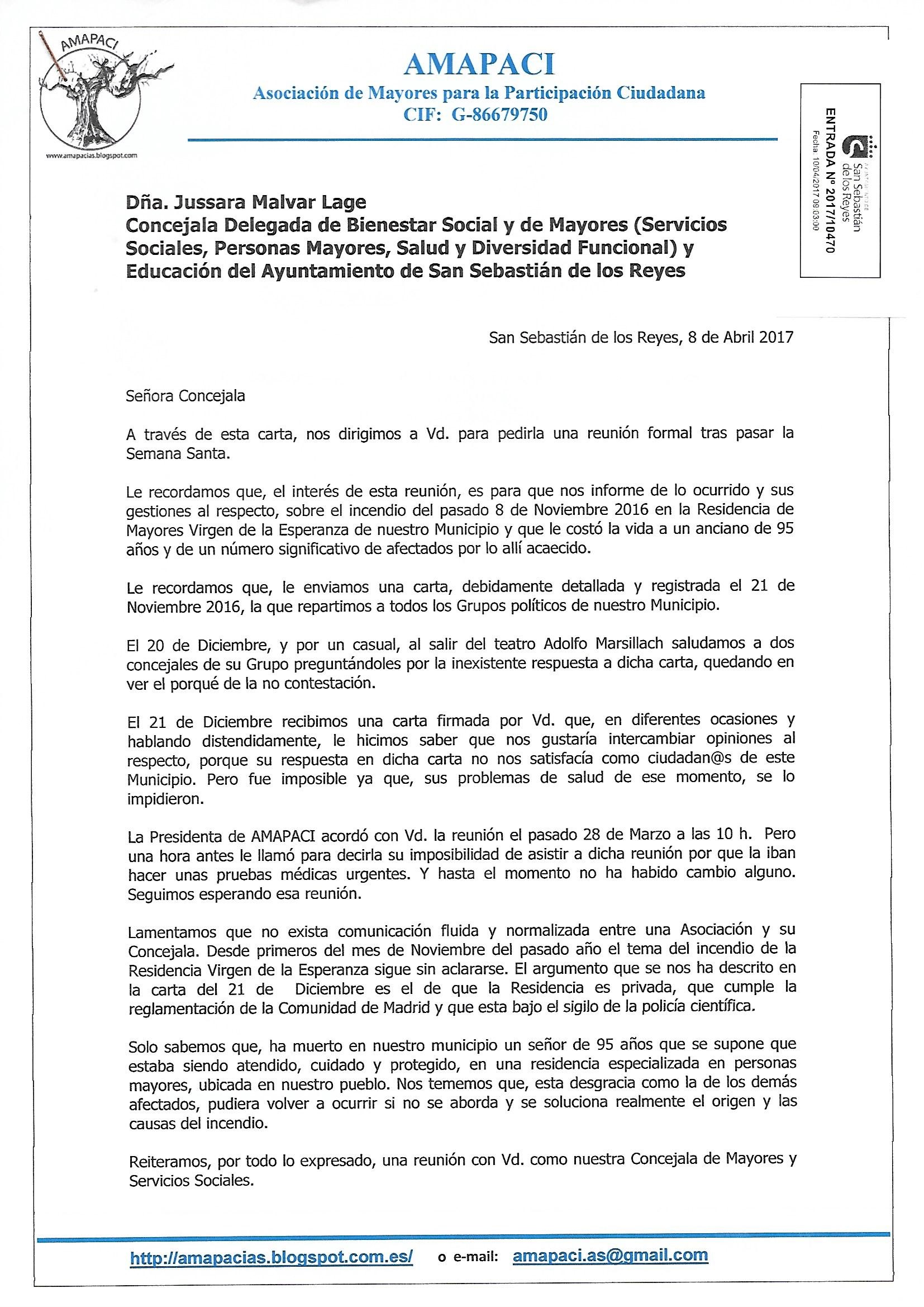 «Nuestra Asociación, Amapaci, ha pedido una reunión con nuestra Concejala de Mayores, Servicios Sociales y Educación para tratar el tema del Incendio de la Residencia de Mayores Virgen de la Esperanza de SanSe, ocurrido el pasado 8 de noviembre de 2016.