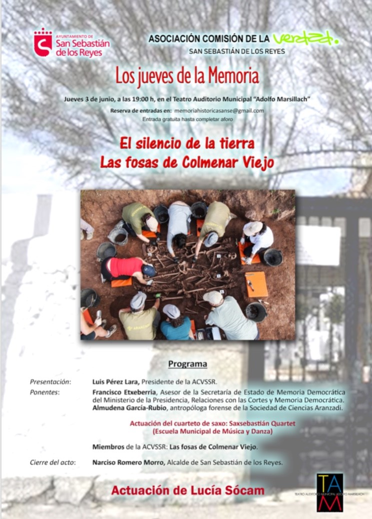La Asociación Comisión de la Verdad de San Sebastián de los Reyes quieren en esta ocasión abordar » los procesos de exhumación de las fosas del franquismo», concretamente las fosas de Colmenar Viejo, situadas en el interior del cementerio eclesiástico, en la que se encuentran 25 vecinos de Sanse entre los 108 fusilados entre abril y noviembre de 1939, de nueve localidades de la zona norte de Madrid.