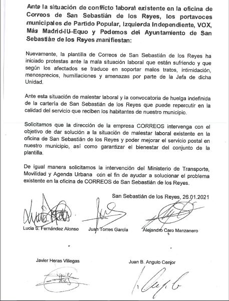Mediante un comunicado conjunto de los portavoces municipales del Partido Popular, Izquierda Independiente, VOX, Más Madrid-Izquierda Unida-Equo y Podemos, han querido hacer público su apoyo a los trabajadores y trabajadoras de esta Cartería que han llegado a afirmar: “estamos ya psicológicamente al límite de lo que humanamente podemos llegar a soportar”.