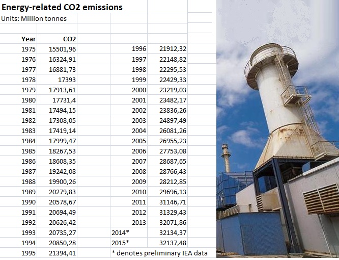 La Agencia Internacional de la Energía (AIE) ha publicado hoy un informe según el cual las emisiones de gases de efecto invernadero procedentes del sector energético se mantuvieron estables en 2015, por segundo año consecutivo. Greenpeace ha valorado positivamente ese dato, «que muestra cómo el trabajo de las políticas nacionales para impulsar las energías renovables está funcionando». Sin embargo -matizan los ecologistas-, conviene no olvidar que las emisiones registradas en 2015 «no dejan de ser las emisiones más elevadas de la historia» (véanse abajo el gráfico y la tabla).