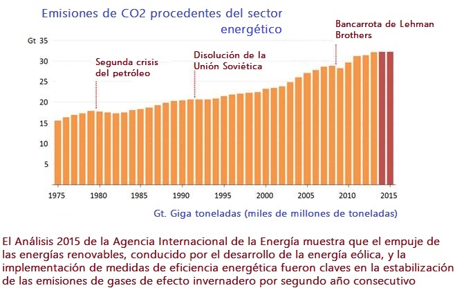 «Las emisiones globales de CO2 procedentes del sector energético -sector que es la principal fuente emisora de gases de efecto invernadero de origen antropogénico- permanecieron planas, por segundo año consecutivo, según los análisis de los datos preliminares para 2015 publicados hoy por la Agencia Internacional de la Energía». El informe de la AIE revela que las emisiones globales de dióxido de carbono se quedaron en torno a los 32.100 millones de toneladas, completando así un bienio -2014/2015- de estabilidad. Los datos preliminares de la AIE sugieren que la electricidad generada por fuentes renovables ha desempeñado en esa estabilización un rol clave. Según la AIE, el 90% de la nueva generación de electricidad en 2015 ha salido precisamente de fuentes renovables. Más aún: más de la mitad de la electricidad adicionada en 2015 la produjo el viento.