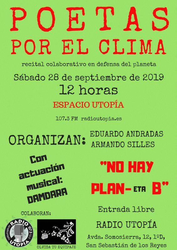 Los organizadores nos avisan de que «NO HAY PLAN B», el Planeta no tiene repuesto, por lo que nos invitan a unirnos a esta denuncia poética para salvar La Tierra. Todo el que que anime a leer un poema propio o de otros está invitado a participar, la única condición es estar en las instalaciones de Radio Utopía el sábado 28 de septiembre entre las 11,30 y las 11,45h, a fin de organizar mínimamente el comienzo de la emisión que tendrá lugar a las 12,00h.