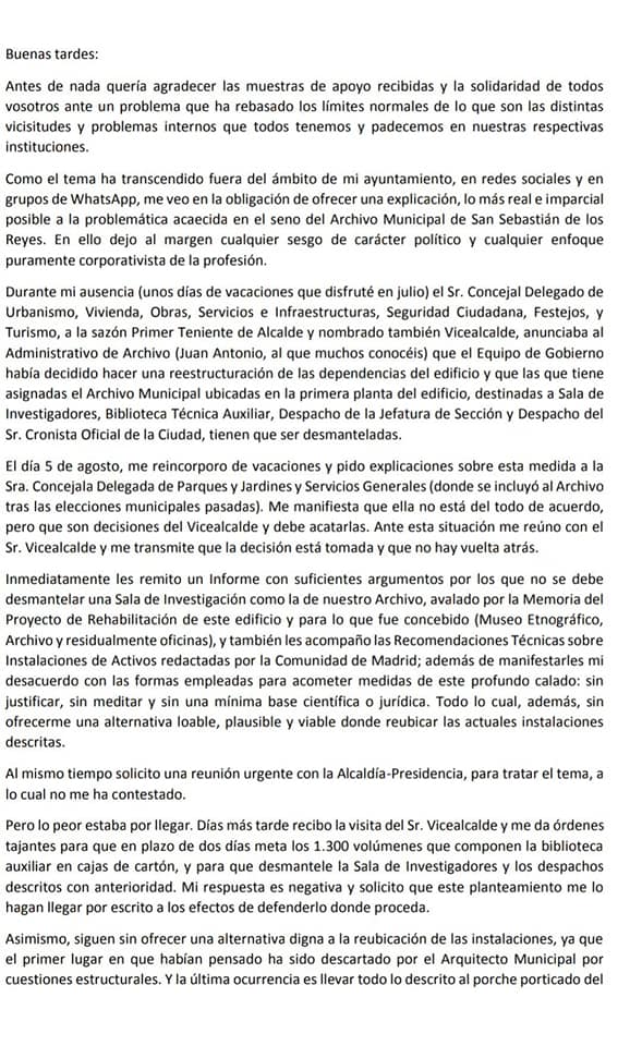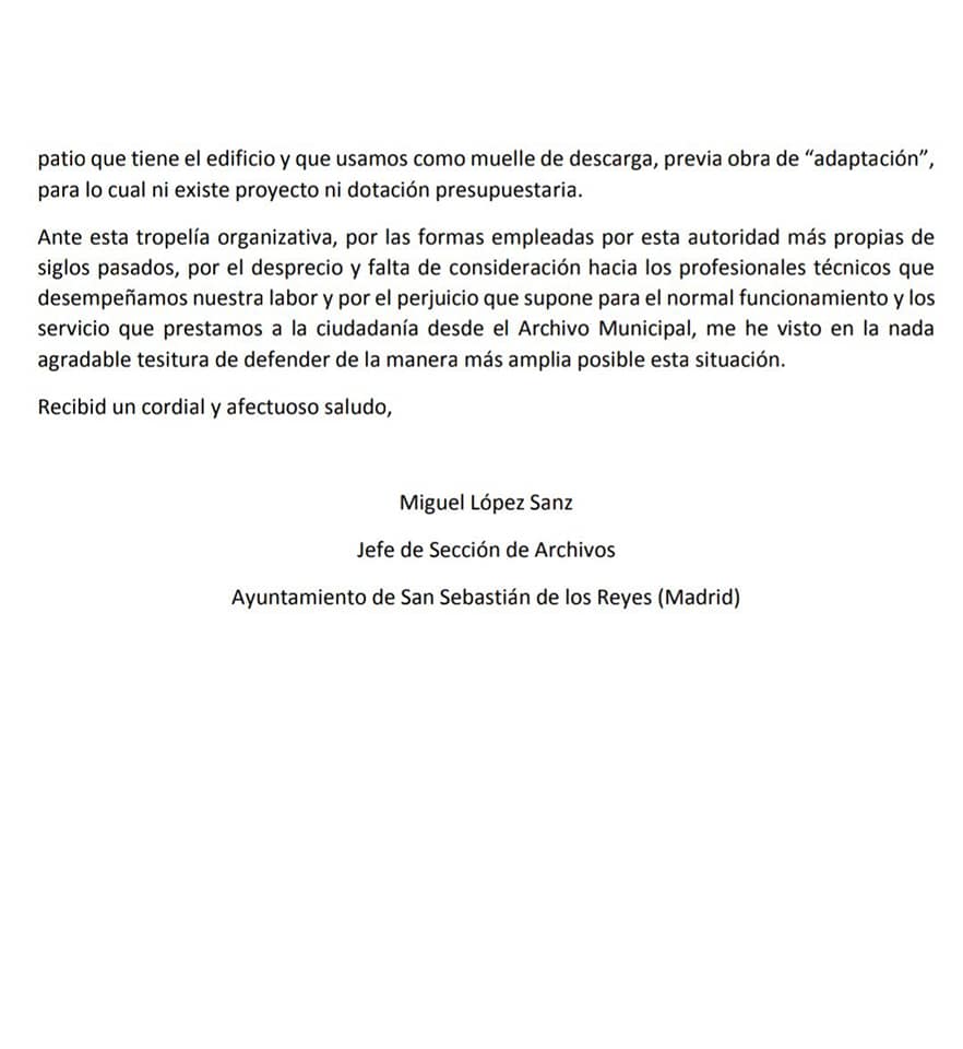 Ante esta tropelía organizativa, por las formas empleadas por esta autoridad más propias de siglos pasados, por el desprecio y la falta de consideración hacia los profesionales técnicos que desempeñamos nuestra labor y por el perjuicio que supone para el normal funcionamiento y los servicios que prestamos a la ciudadanía desde el Archivo Municipal, me he visto en la nada agradable tesitura de defender de la manera más amplia posible esta situación.