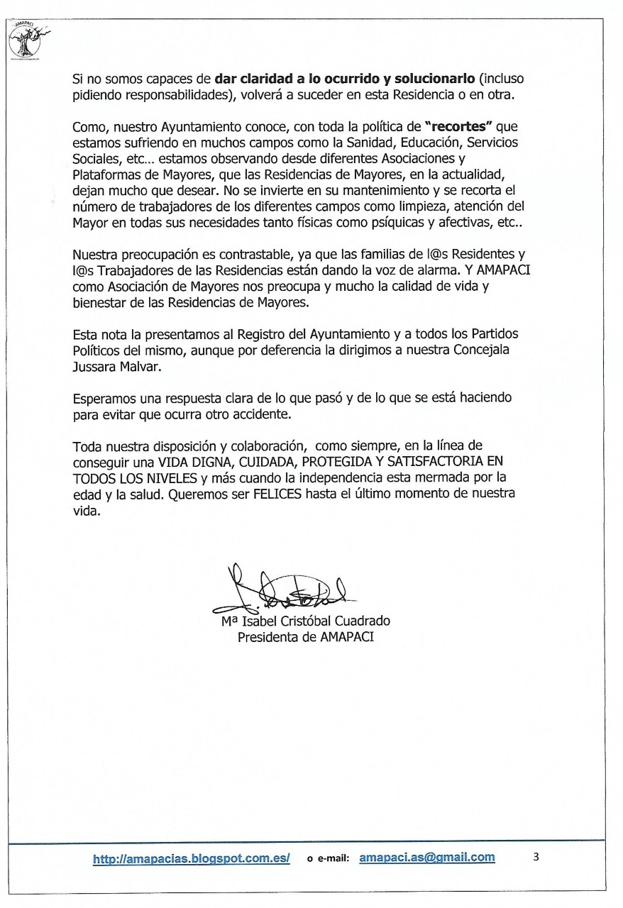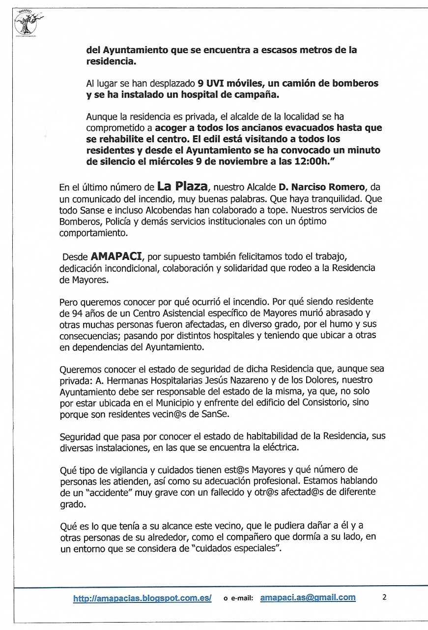 El Colectivo AMAPACI, Asociación de Mayores para la participación Ciudadana, relata en la carta que dirige a todos los grupos políticos municipales y con prioridad a la Concejala de Bienestar Social y Mayores, su preocupación por lo sucedido en el incendio de la Residencia de mayores Virgen de la Esperanza, y solicitan se les informe de lo acontecido, de cuales han sido las causas del incendio, «de las condiciones de seguridad y habitabilidad de dicha residencia, que tipo de vigilancia y cuidados tienen estos mayores, que número de personas les atiende y cual es su adecuación profesional».