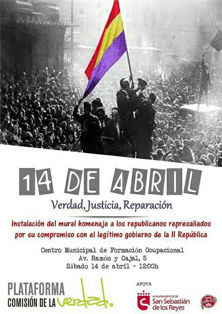 El Grupo de trabajo por la Memoria Histórica de San Sebastián de los Reyes (formado por familiares de víctimas, vecinos y vecinas, movimientos sociales y partidos políticos de la zona), junto con la Plataforma Comisión de la Verdad y la colaboración del Ayuntamiento del municipio, organizan este acto de homenaje y reconocimiento a los republicanos que en este rincón de Madrid fueron leales al sistema democrático emanado de la urnas, y por ello pagaron con su vida.