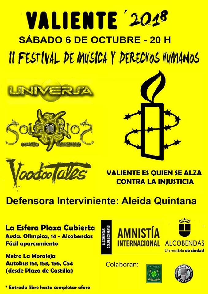 Amnistía Internacional celebra el próximo sábado 6 de octubre «Valiente 2018», el II Festival de Música y Derechos Humanos que tendrá lugar nuevamente en Alcobendas.