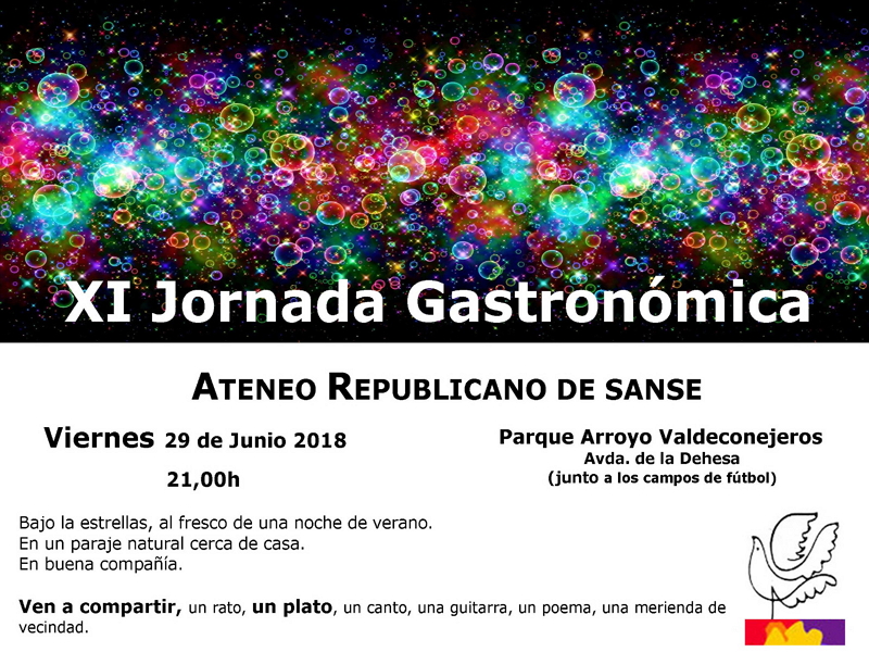 El Ateneo Republicano de Sanse celebra hoy viernes 29 de junio su XI Jornada Gastronómica. Se celebra como siempre en el Parque del Arroyo Valdeconejeros de San Sebastián de los Reyes, a partir de las 21h cuando el sol deja de ser protagonista.